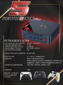 Nueva y Ultima versión RetroGbox 5 Ultra 2027, la Consola mas pequeña, potente y completa del mercado, ensamblada y configurada en Colombia, Ahora con mas 20,000 juegos, más de 85 plataformas, incluye Play2, Wii U, 3ds, Xbox, Gamecube, Wii, Psp, Ps1,Nintendo 64, shiwtch ,Vita , Ps3, Ps4, 3dNes, Clone Hero, y muchas más, soporte 4k, Graba Progresos, Juega en línea, ingresa o retira juegos, Disfruta de juegos disparos, Baila, Juega en familia , opción de adicional de Windows, conecta 2 monitores , 1 año de garantía, soporte, actualizaciones permanentes, adiciona más controles y accesorios exclusivos de RetroGbox