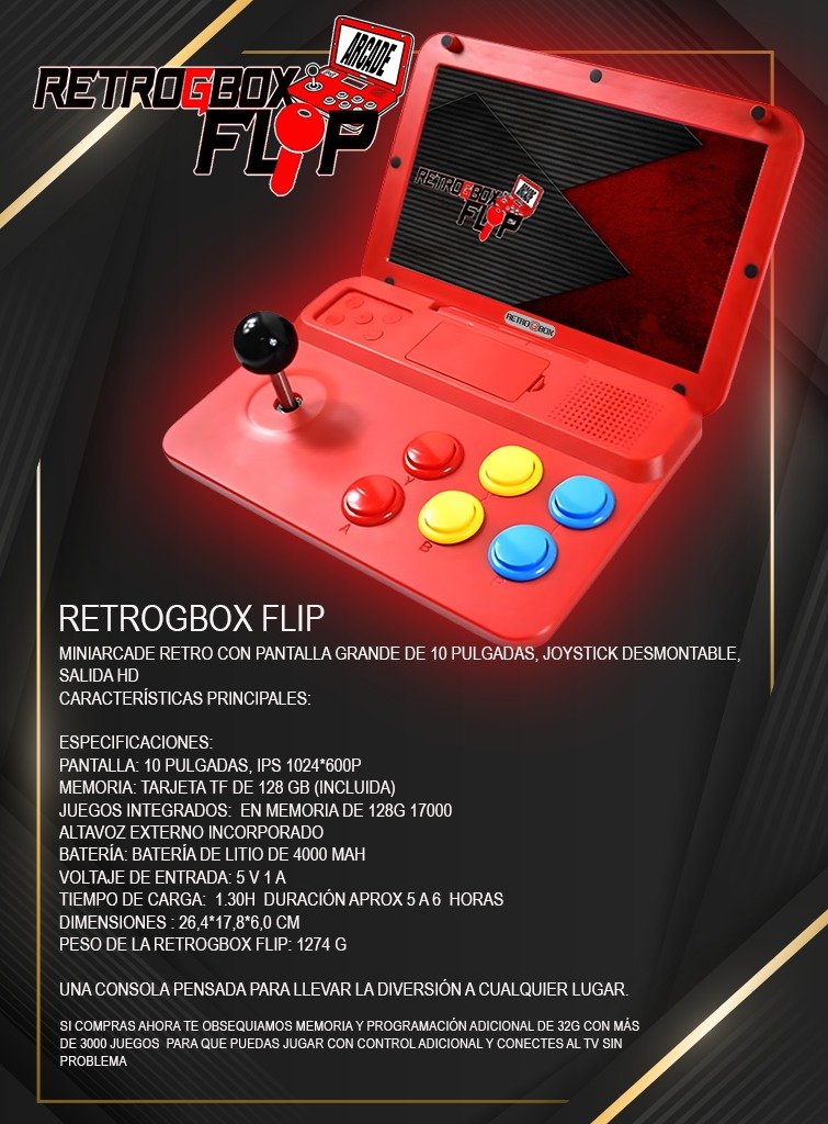 RetroGbox Arcade Flip es una consola portátil, con mas de 17000 juegos integrados, es la mejor opción para revivir la diversión de tu infancia y compartirla con tus hijos y familia.